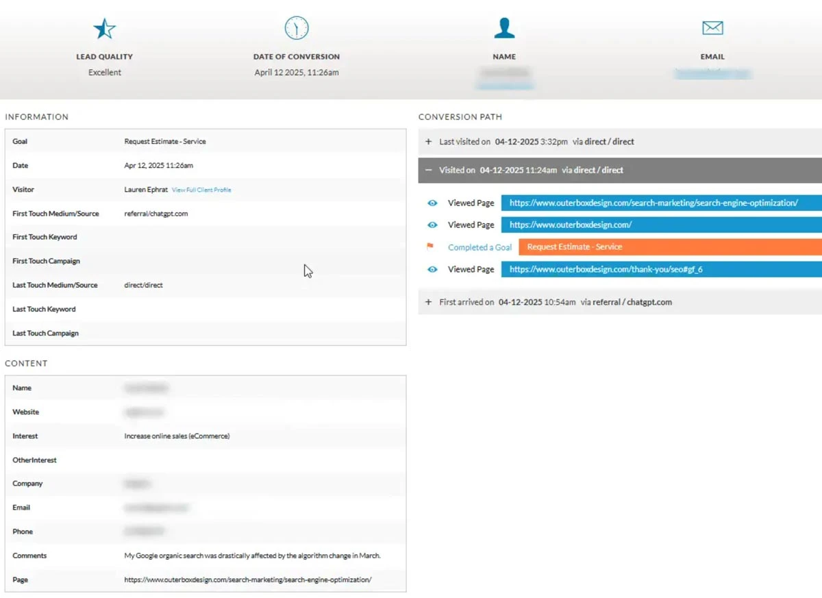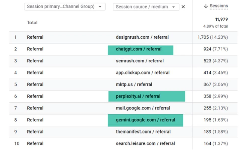 Google Analytics quantifies traffic by source, landing page performance, and overall conversions. Once you’ve gathered baseline traffic metrics, particularly for organic and paid sources, it’s essential not to overlook referral traffic. What was once a catch-all is now a major success metric, with LLM channels like ChatGPT and Perplexity included.