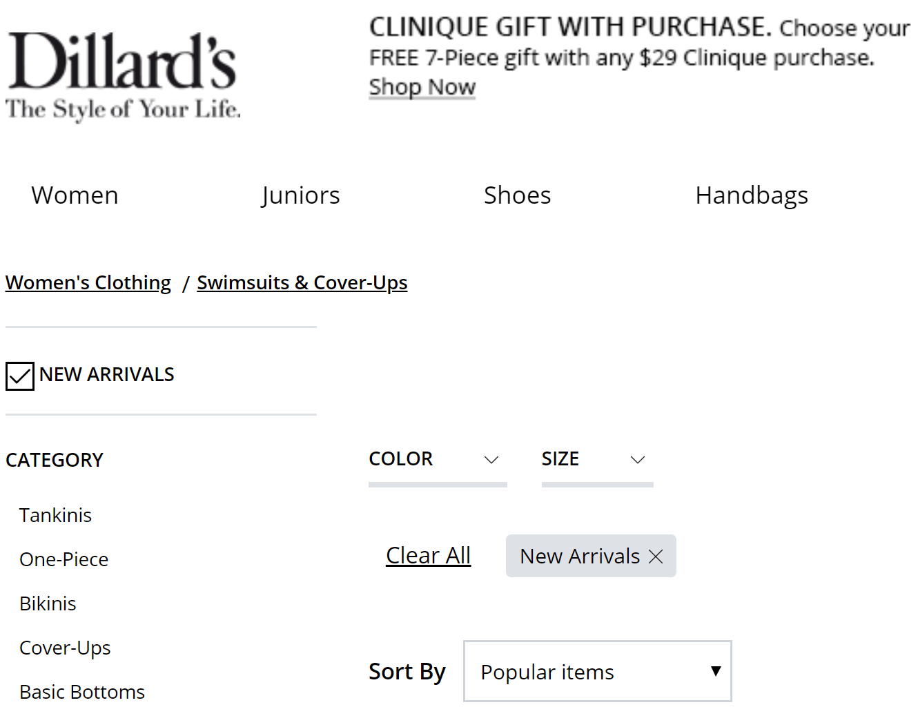 Instead of trying to push your best sellers and highest-rated items, showcase some of your new and fresh arrivals. When your loyal customers buy these items and review them, they can turn into your best sellers that new customers love, as well. At the very least, you can add a New Arrivals filter to your product listings like Dillard’s.
