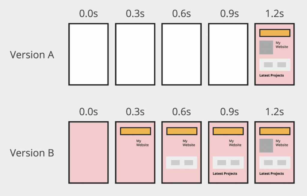 While purely hypothetical, a web user would think that the second strip on the bottom is a better experience, even if the two pages take the exact same time to load.