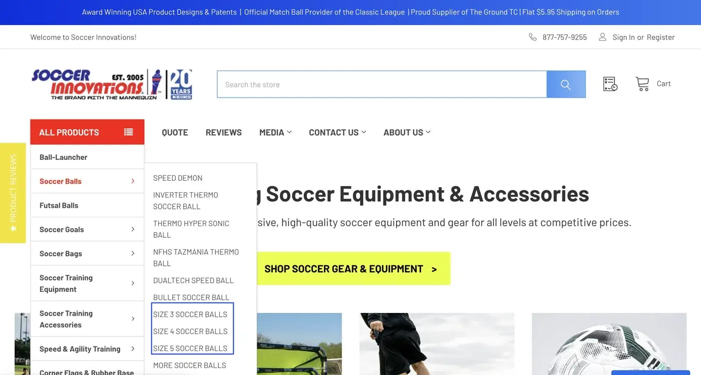 Soccer Innovations’ data shows that users often search for brands and specific details, such as size. Before this project, the Soccer Innovations website featured “Soccer Balls” in its product navigation, followed by brand subpages. Coaches and players know that soccer ball sizes affect player development and safety, especially for children. These subcategories presented a major opportunity not seen in many of their competitors, which typically stopped at filters on the ball and brand subcategory pages. Each ball size (3, 4, and 5) offered users quicker access to available products in their desired size, information about typical ages and uses for that size, as well as information about materials.